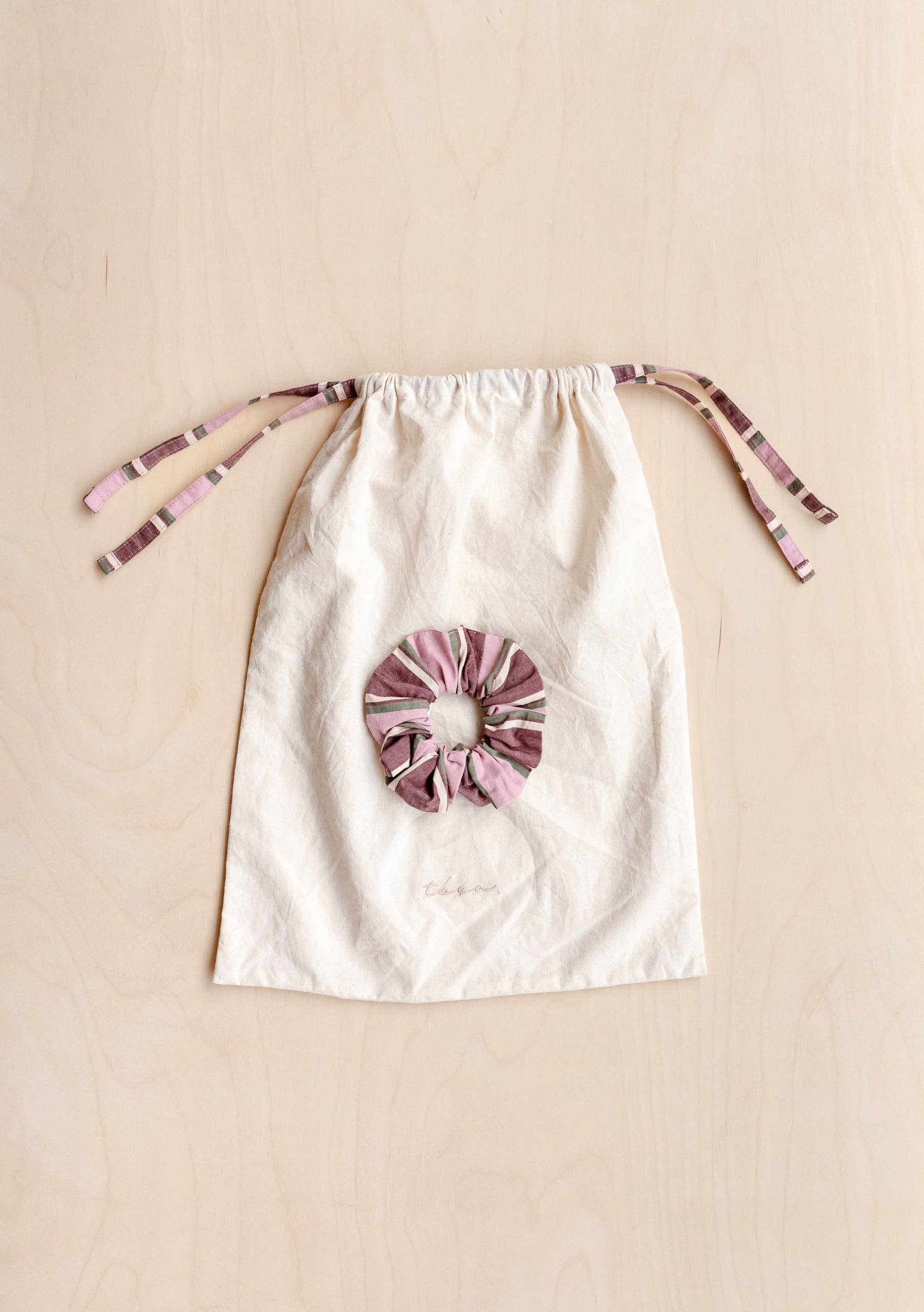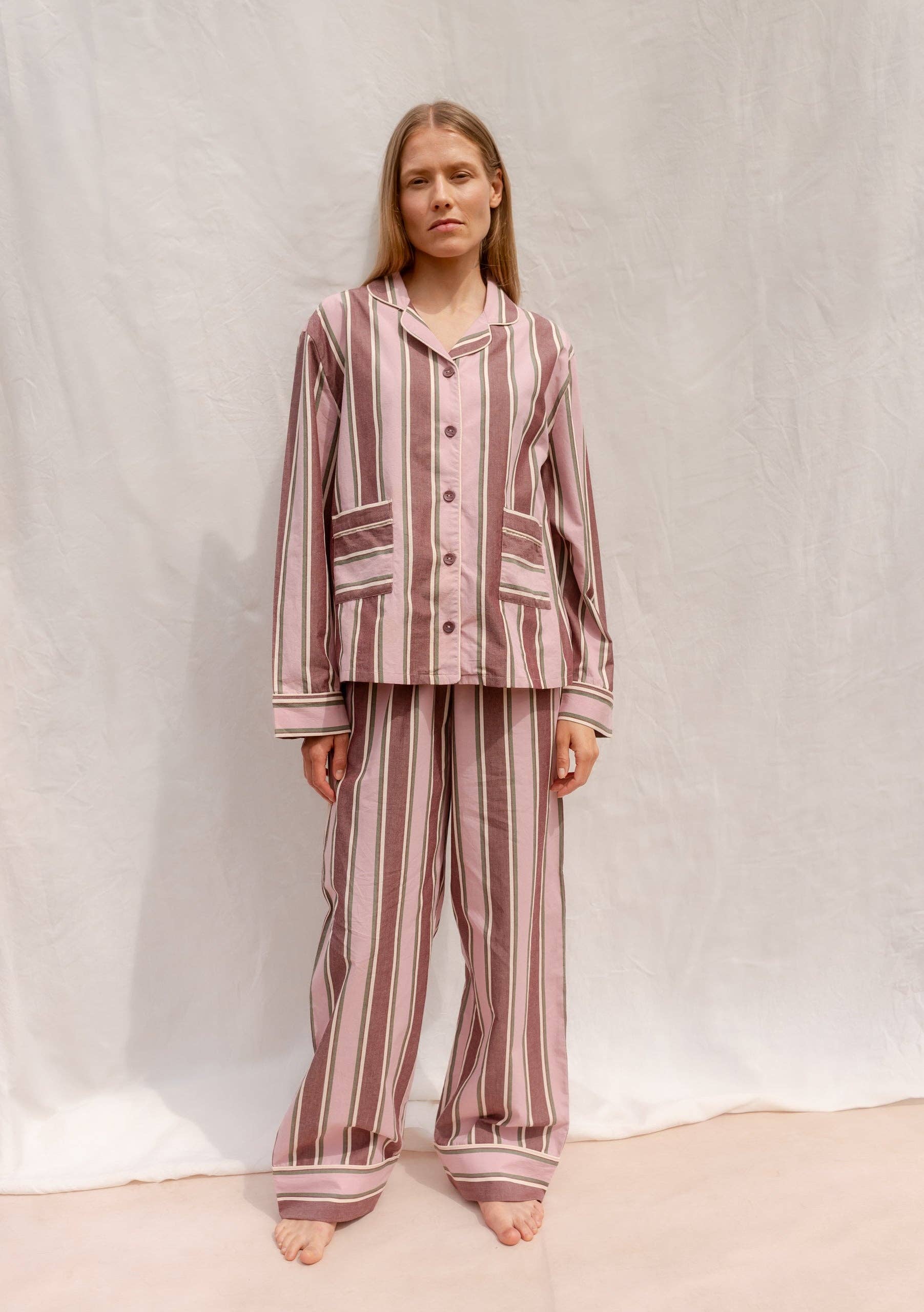 These pink and burgundy striped pyjamas are made from soft, breathable 100% cotton for all-day comfort. With an elastic waistband, pockets, and contrasting buttons, they’re easy to wear and perfect for relaxing or sleeping. The set includes a matching scrunchie and a cotton bag for storage or travel. Designed in Edinburgh and easy to care for with machine wash instructions.