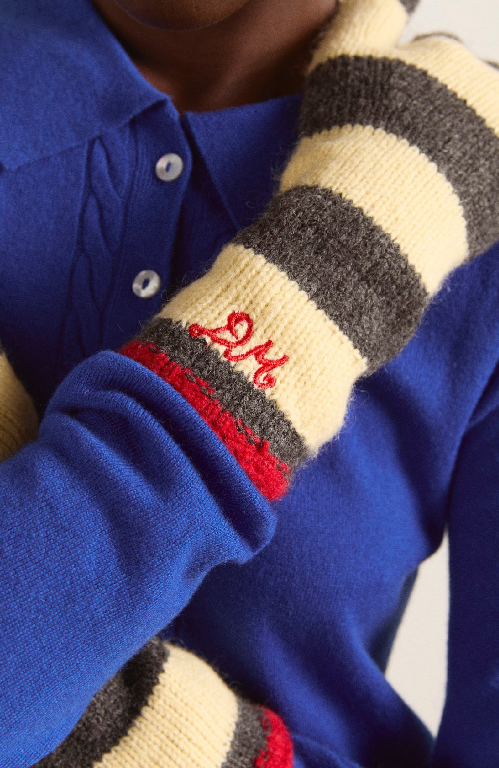 Effortlessly stylish and warm, these longer-length knitted gloves feature a bold stripe design and subtle DM embroidery. Crafted from a soft blend of wool, mohair, recycled nylon, and acrylic for lasting comfort and durability.
