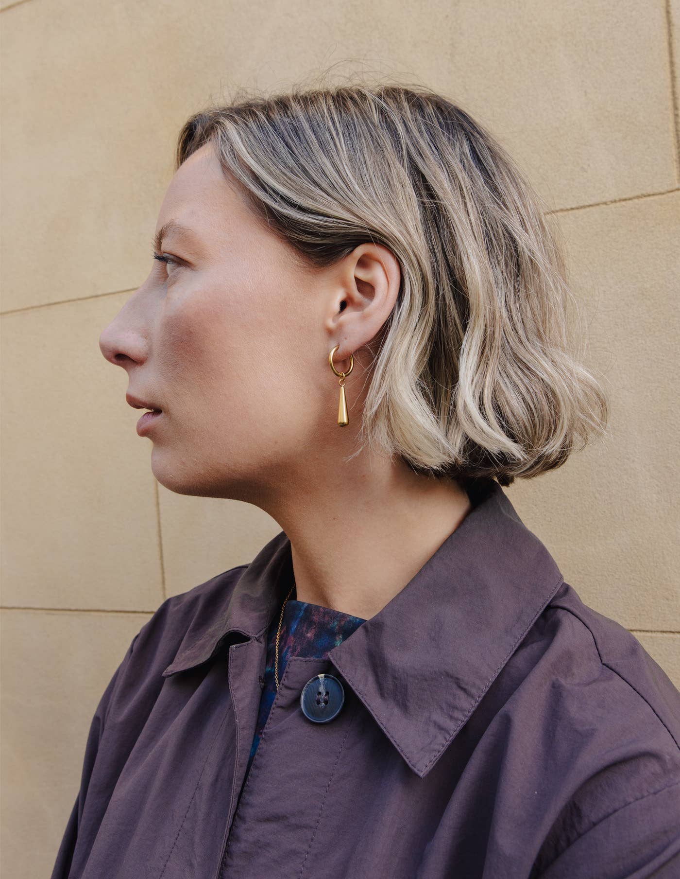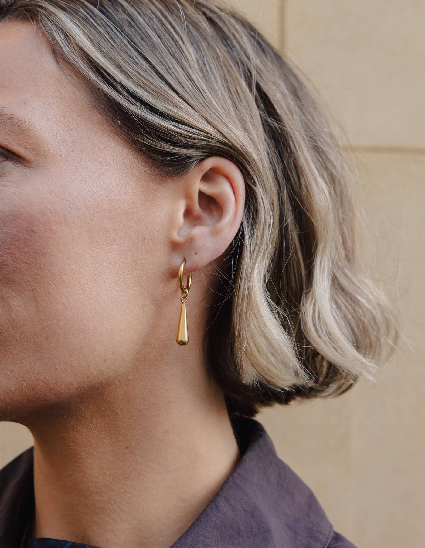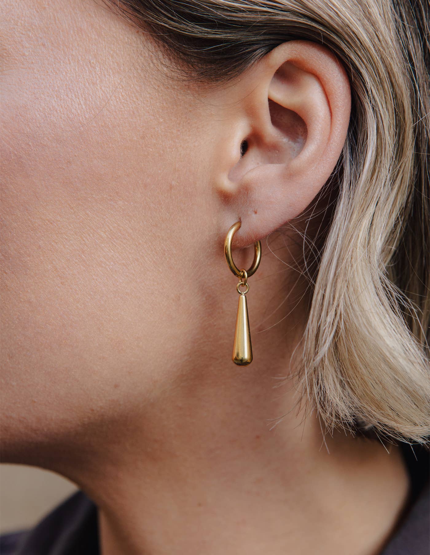 The gold elongated drop earrings feature a smooth, tapered teardrop suspended from a classic hoop. finished in tarnish-free gold plating, their clean lines and fluid form offer a modern take on minimal drop earrings, balanced, polished, and versatile.
