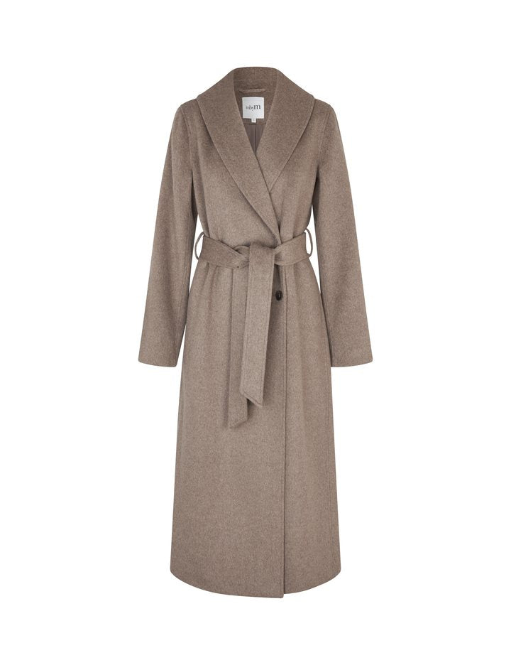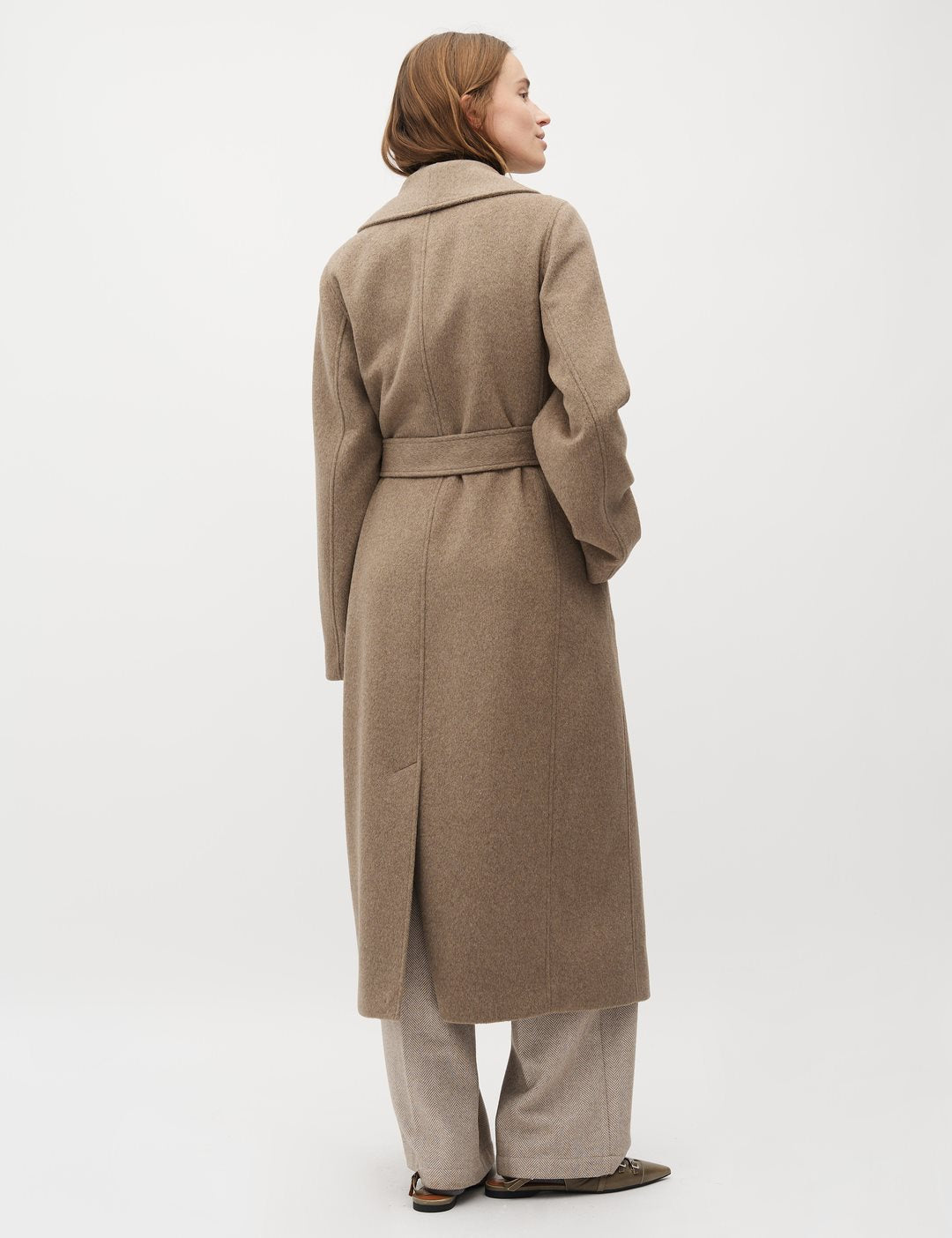 Long coat with ties from mbyM. - Material: Shell: 50% Wool, 45% Polyester, 5% other fibers. Waistband: 100% Polyester - Maxi length - Side pockets - Two button closure - Back slit - Ties - Long sleeves The model is 176 cm tall and is wearing a size S.