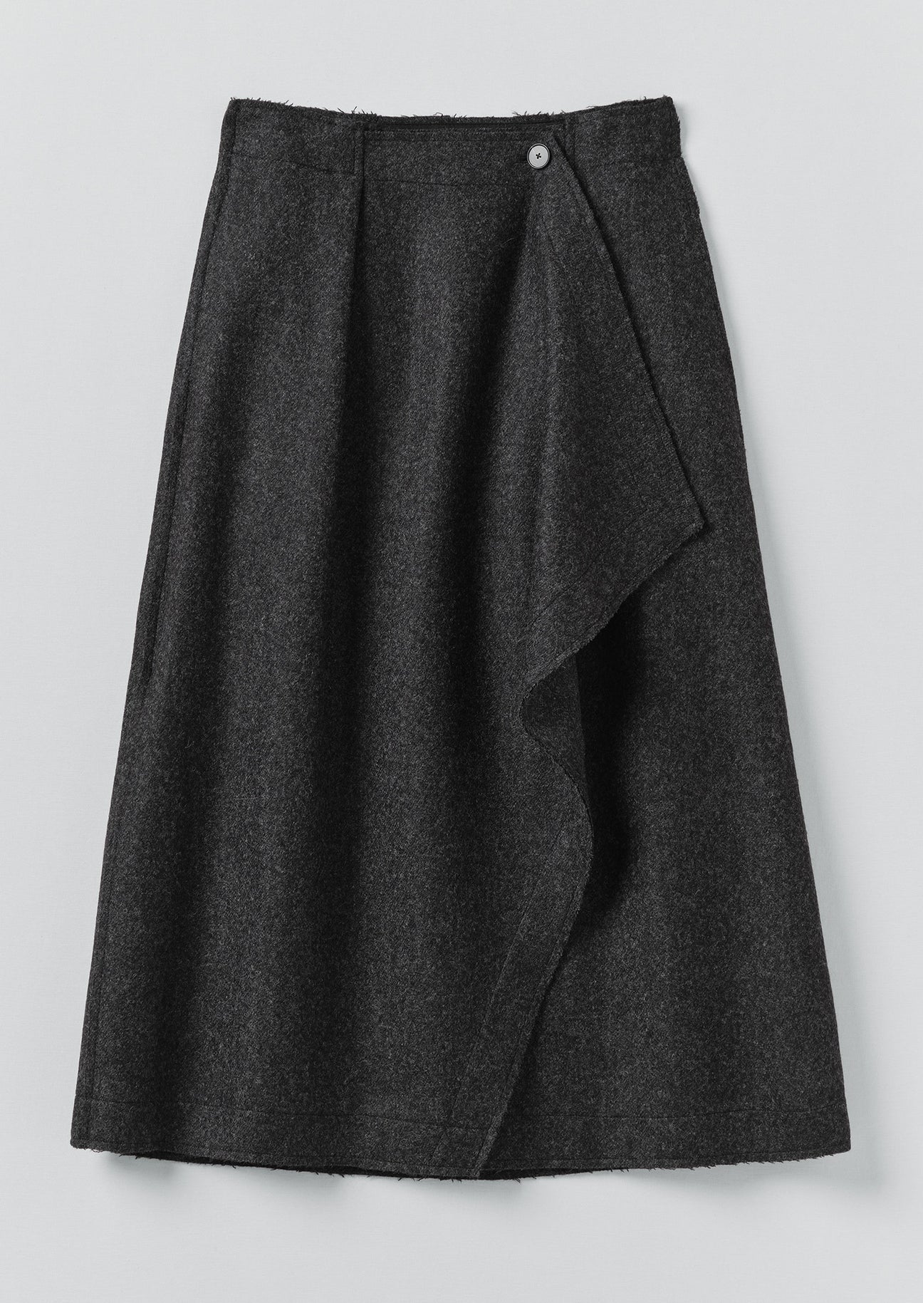 Skirt made from mottled boiled wool, featuring front pleats and a gently draped asymmetrical wrap panel. With dart shaping at the back and a grown-on waistband, finished with in-seam side pockets and raw, lapped seams.