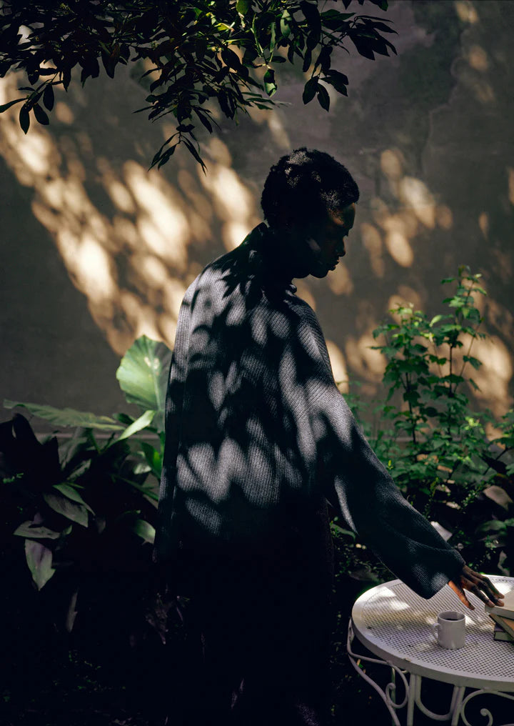 Brushed linen and organic cotton herringbone brings a softness and drape to our rib-knitted sweater. With an oversized, effortless silhouette. Shaped with a high neck and dropped shoulders, then finished with side slits.