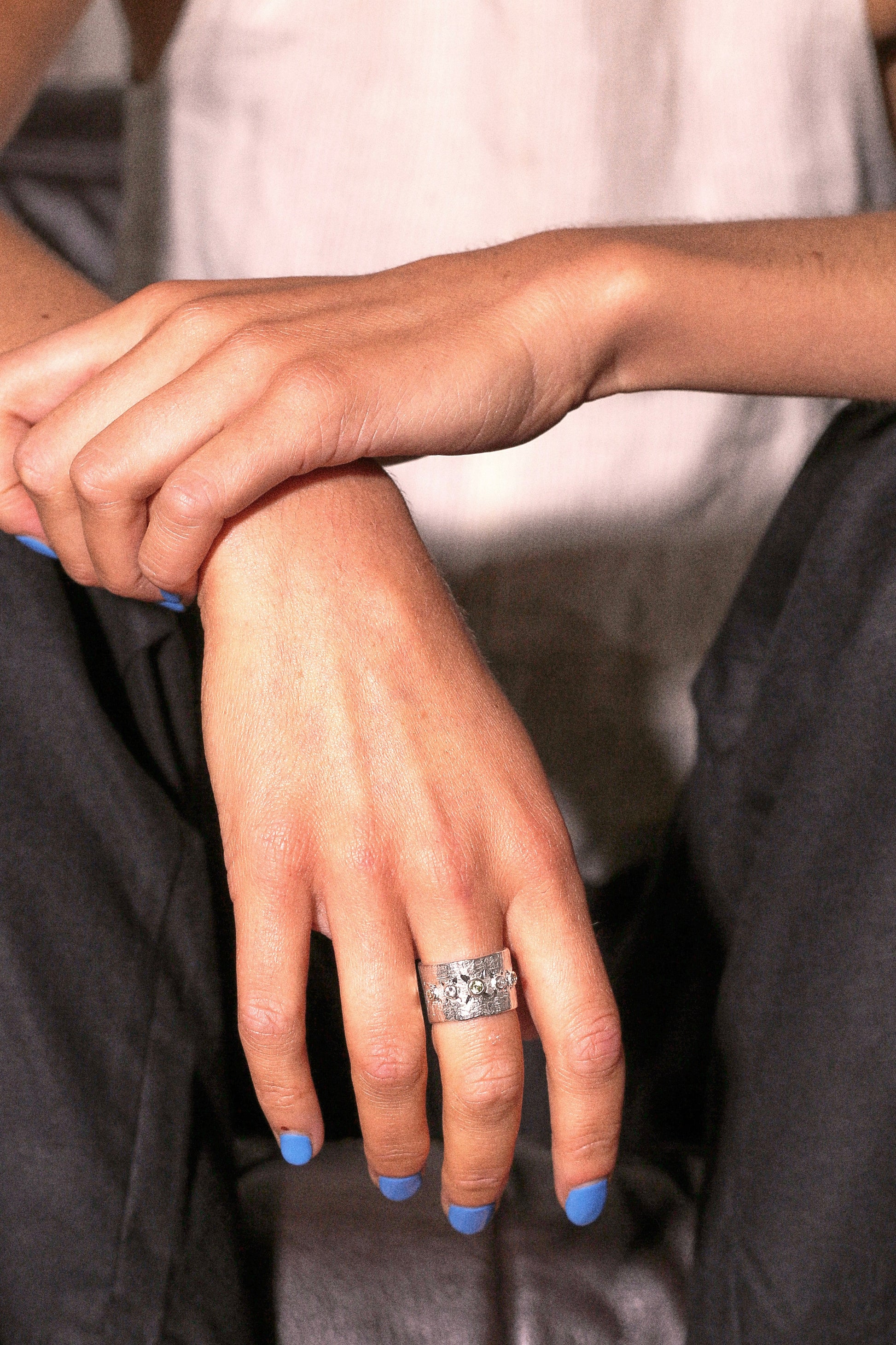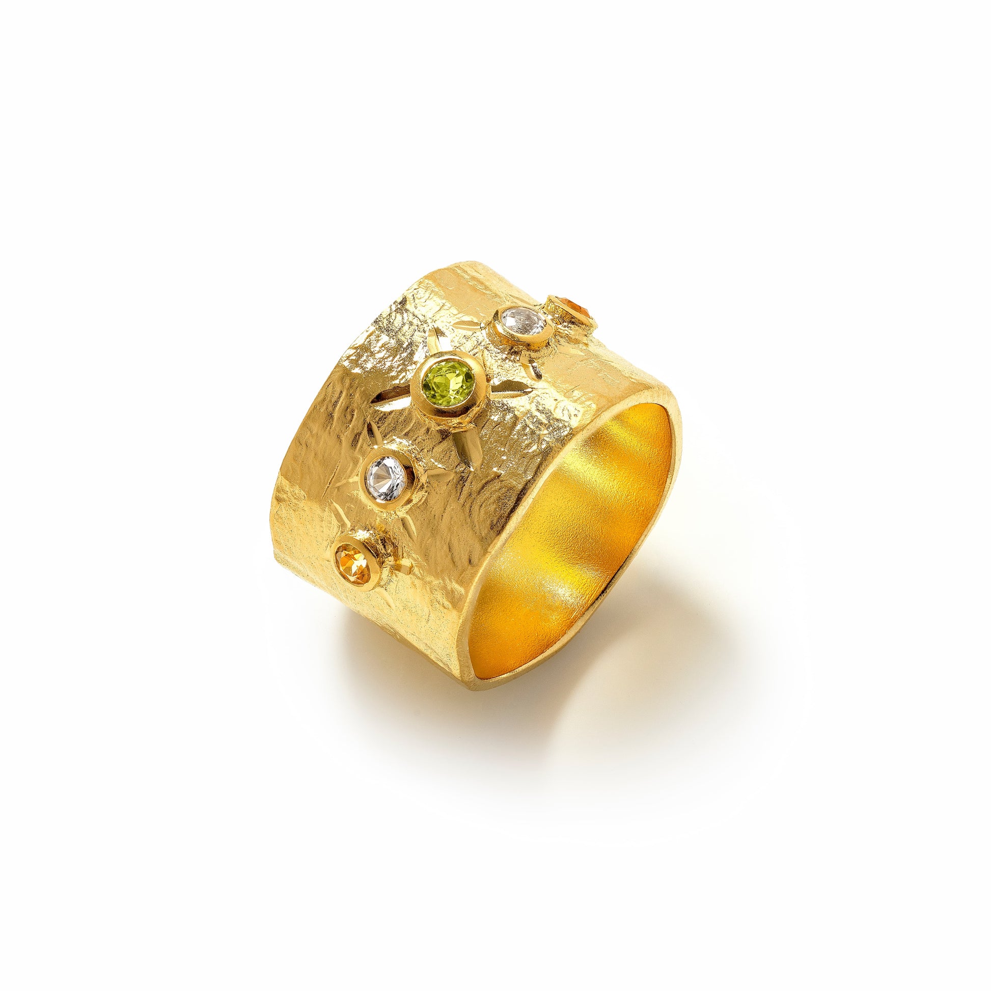 A round ring band ring with peridot, citrine and white topaz studs.