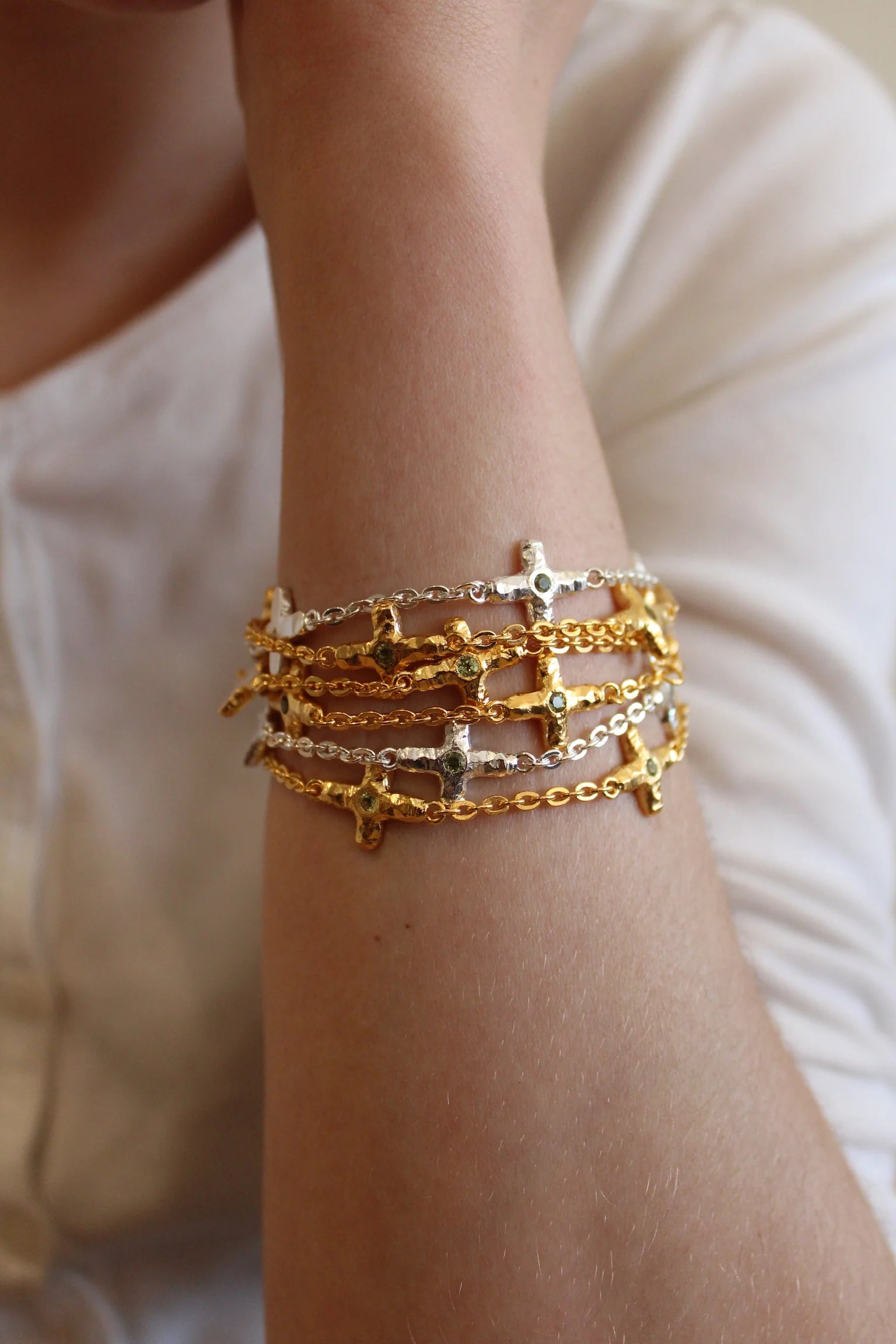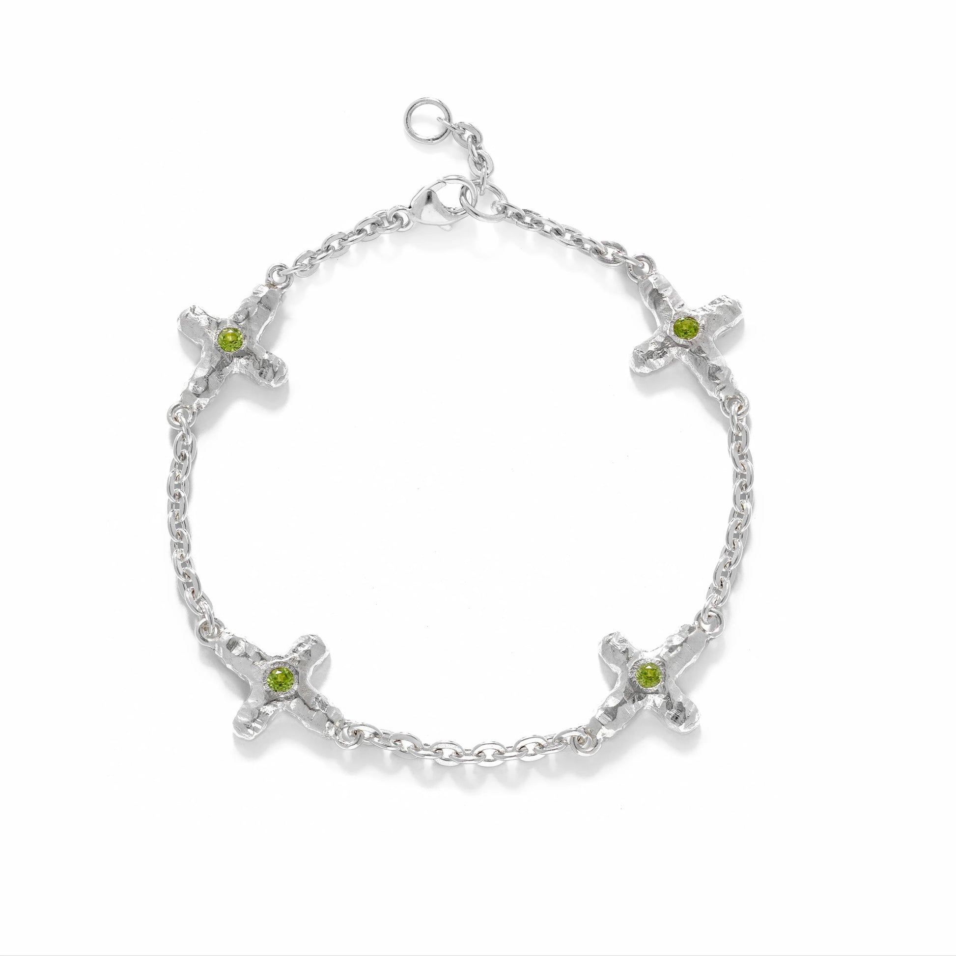 A beautiful cross chain bracelet with peridot stones on each cross. Stunning quality, pair it with our Florence necklace and Juno stud for a look that's dripping in crosses